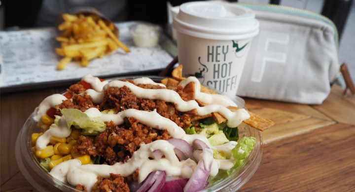 We stood and ordered at the counter where I could see an array of the salad ingredients; a bit like Subway but without that weird smell (I’ve never been a Subway fan). I decided on the Taco Bowl. I have to say this is purely because of another food blogger’s Instagram stories; Nutella Tasha was enthusiastic about that option, and I trust her opinion. I also went for a Matcha Latte with coconut milk; I liked how you could switch your plant-based milks depending on your taste, at no extra cost. Marv went for a Son of a Bun Burger and a Hot Chocolate with coconut milk also. Because we chose to eat in; we were encouraged to take a seat, get comfy, and our order would be brought out to the table; another nice, welcoming touch. Even though there was a queue; the food and drinks were coming out pretty quickly, so don’t be put off if you’re after something speedy on your lunch break and Fressh looks full; you will be served in good time (and with a smile).